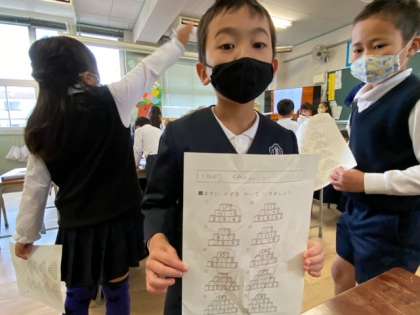 算数科で、数字のピラミッドに挑戦しました。ますに数を書いて完成させます。見事にできました!