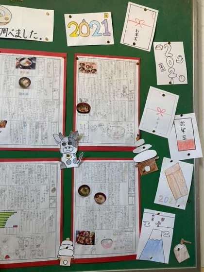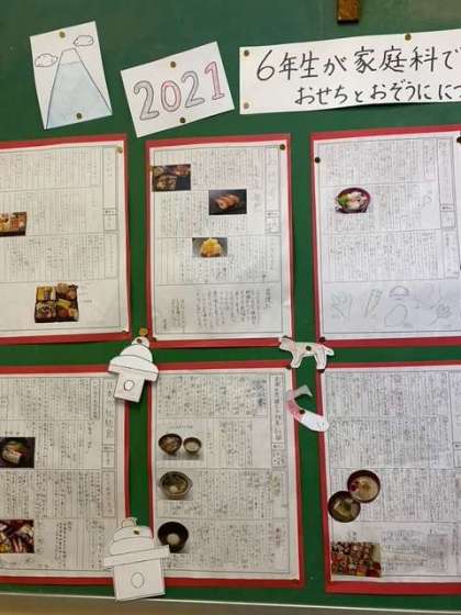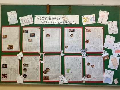 6年生の子どもたちが、家庭科で学習した「おせちとおぞうに」の新聞が、掲示してありました。パソコン教室でも調べ学習をしました。写真を添えて、調べたことをまとめました。