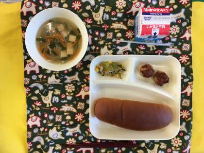 あげシューマイ、とうふのスープ、ツナとチンゲンサイのいためもの、ご飯、牛乳