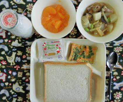 豚肉とだいこんの煮もの、チヂミ、みかん(缶)、食パン、りんごジャム、牛乳