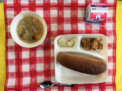 鶏肉のバーベキューソテー、ウインナーとキャベツのスープ、焼きじゃが、おさつパン、牛乳