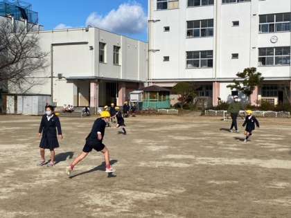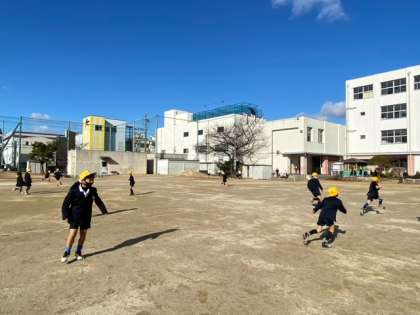 休み時間、運動場では3年生の子どもたちが、先生と一緒に鬼ごっこをしていました。元気いっぱいです。