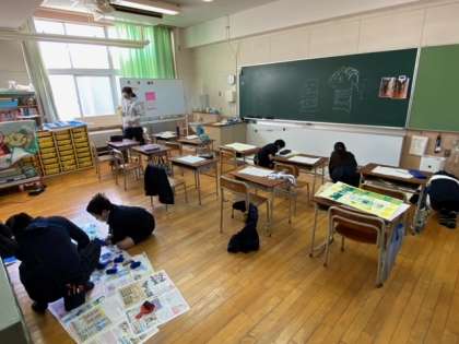 作品展に向けての取り組みをしていました。ローラーを器用に使って画用紙に絵の具を塗っています。