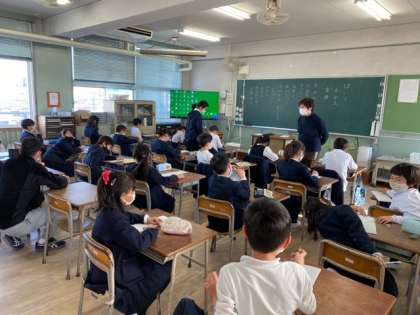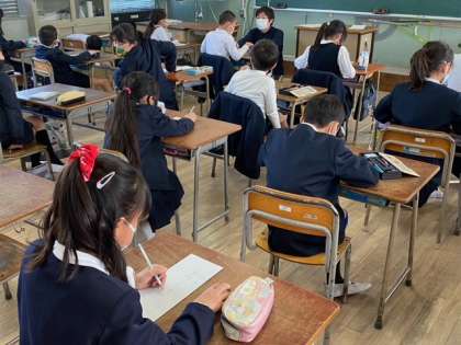 2組は、冬の季語を使った「はいく」づくりをしました。「冬休み・年賀状・お年玉……」子どもたちは、五・七・五を意識して考えていました。