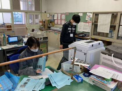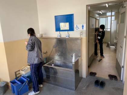 毎週金曜日は、教職員と一緒に大学生のスクールサポートスタッフが清掃・消毒作業をしています。印刷や学習補助もしてもらい、とても助かっています。