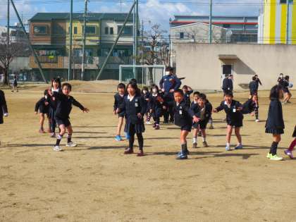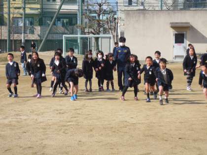 運動場で立ち止まっている集団があり、何をして遊んでいるのかと近づくと・・・大勢で「だるまさんが転んだ」をしていました。