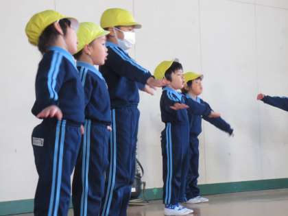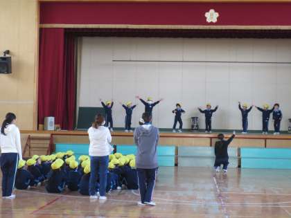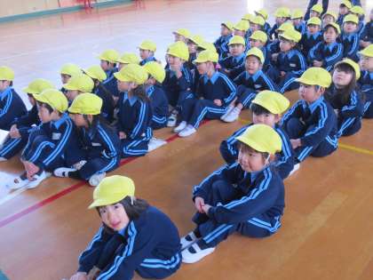 日の出学園が巽南小学校の講堂で、2/15(日)に生活発表会をします。今日はその練習に園児のみなさんが来ていました。