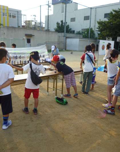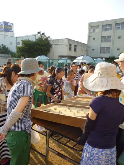 校庭には、保護者の皆さんが準備した夜店がたくさん立ち並び、そこで遊ぶ子ども達。どの子も楽しそうです。