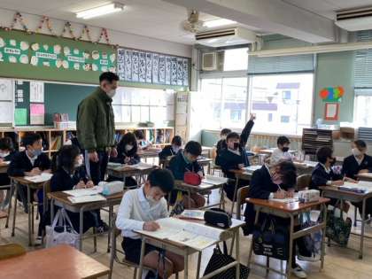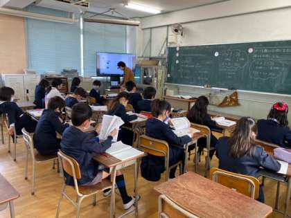 算数科の少人数授業です。「かける数が10倍になると答えはどうなるのか」のめあてで、「12×3と12×30の式を比べよう」の問題を解きました。見通しをたててじっくりと考えていきます。
