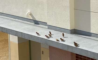 校舎のひさしでは、降り注ぐ日光を受けてスズメが日向ぼっこをしていました。