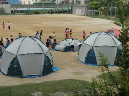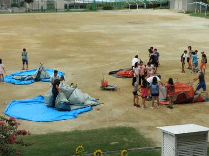 夜はひそひそ話が・・・そして早朝からは、にぎやかでした。思い出のテントを片付けて、ふれあいキャンプもあと少しで解散です。