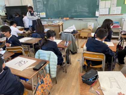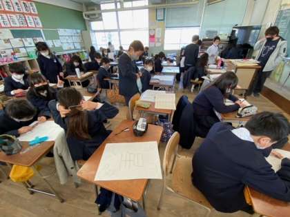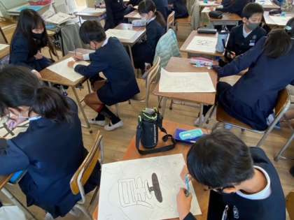 図工科で版画をします。今日は、画用紙の真ん中に「好きな漢字」を一つ書き、それに関連した絵を描いてデザインしました。「星」「空」「光」……どんな作品ができるのでしょう。