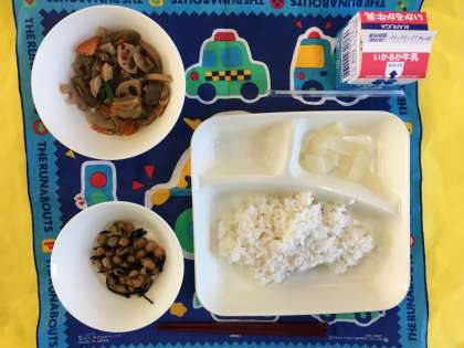 大豆にでんぷんをまぶして油で揚げ、味付けしたひじきと混ぜ合わせています。鉄分やカルシウムが多く含まれた献立です。ご飯に合う一品です。