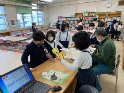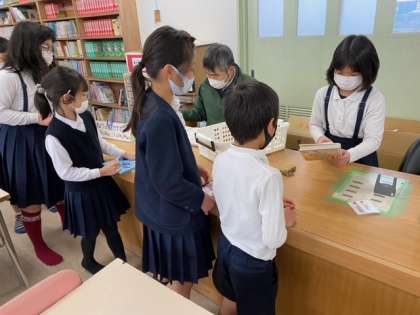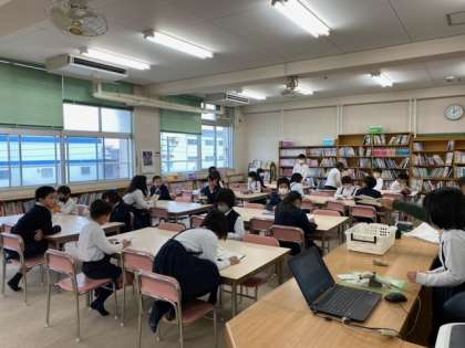 国語科(図書)の時間です。係りの児童が手際よく本の返却作業をしています。そのあとは、それぞれ読みたい本を見つけて静かに読書をしました。