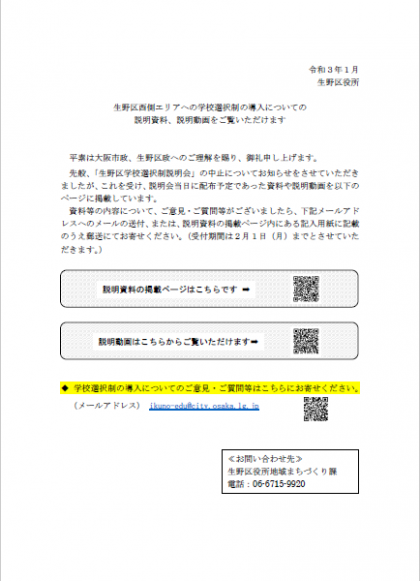1/25 生野区西側エリアへの学校選択制の導入にかかる説明資料、説明動画について