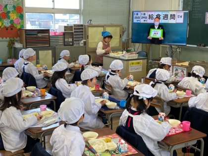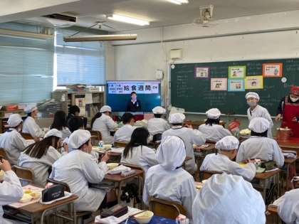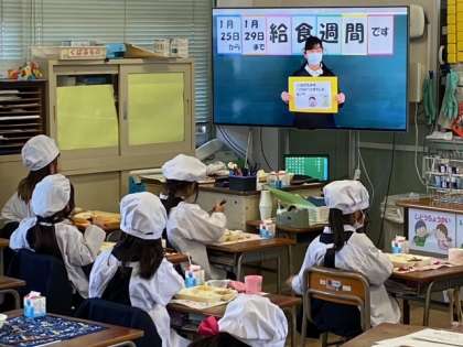 給食週間にちなんで、給食委員会の児童が「食べものの命をいただいて自分の命を養っていること、食べものを無駄にすることなく大切にすること、給食にたずさわってくれた人々に感謝の気持ちを持つこと、食事のマナーを知り楽しい給食の時間にすること」をビデオで発表しました。