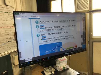 1組が「水の量とものがとける量」について実験をしました。