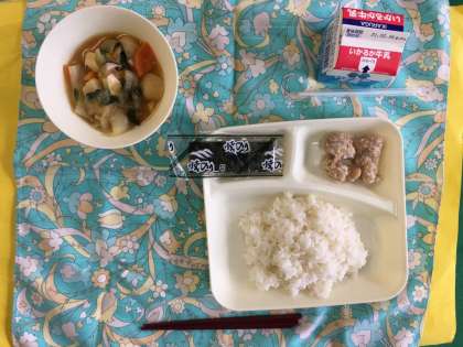 鶏肉のからあげ、まる天と野菜のうま煮、焼きのり、ご飯、牛乳