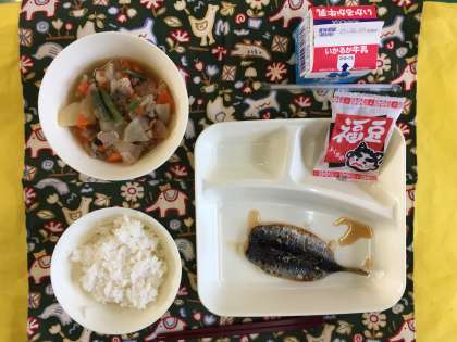 いわしのしょうがじょうゆかけ、含め煮、いり大豆、ご飯、牛乳