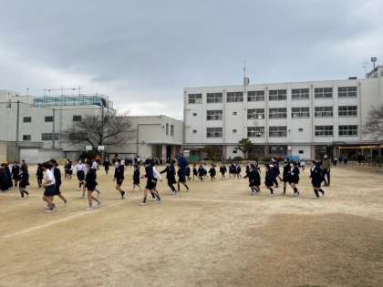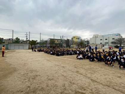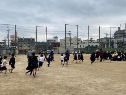 避難指示の放送で「押さない・走らない・喋らない・戻らない(お・は・し・も)」を意識して、校舎内から運動場へ、運動場に出てからは駆け足で集合しました。
