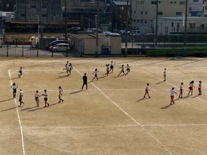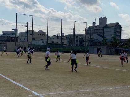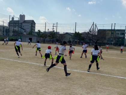 体育科で、フラッグフットボールをしました。チームワークを大事にしながら活発に動いています。
