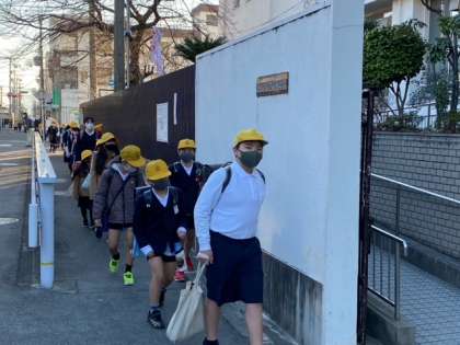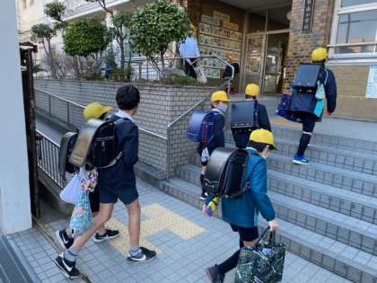 始業前の校庭では、1年生の児童が、鉢植えのチューリップに水やりをしていました。