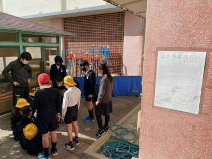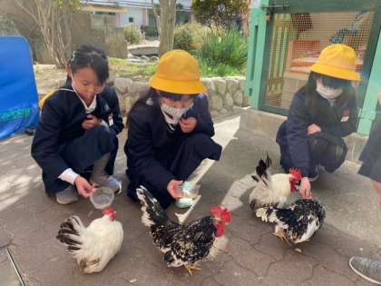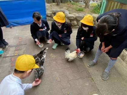 飼育栽培委員会の児童たちが、この休み時間を利用して、「にわとりとのふれあい・金魚のえさやり」を企画し、2年生の子どもたちが、にわとりにえさを与えていました。