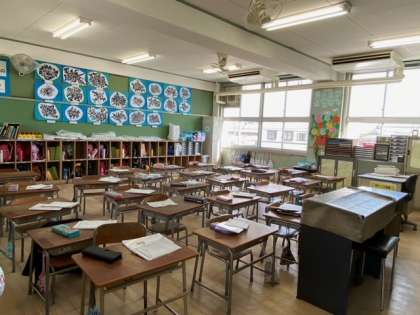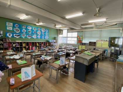 1年生の教室は、誰もいません。遊ぶときは遊ぶ、全員元気に外遊びです。
