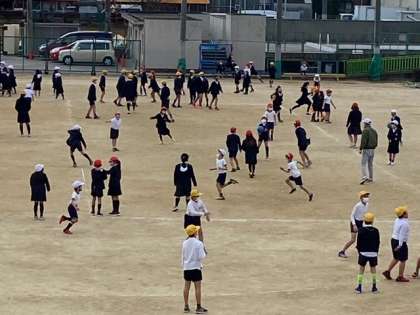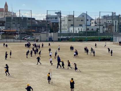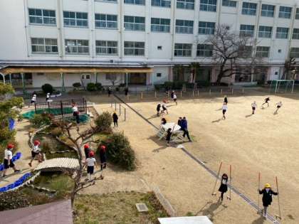 子どもたちが、運動場でおもいおもいに遊んでいます。