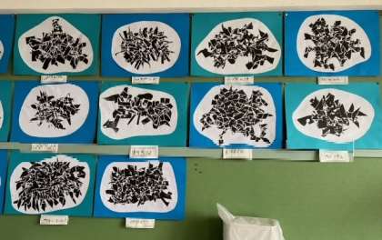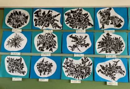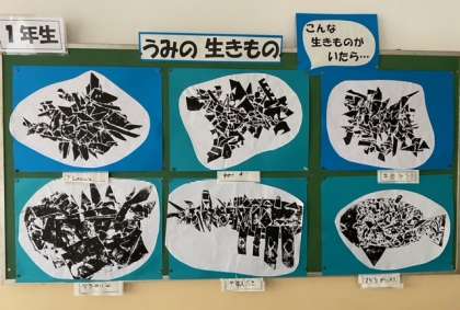 1年生の図画工作科の作品(版画)「うみの生きもの」です。学年掲示板とそれぞれの教室に掲示されています。