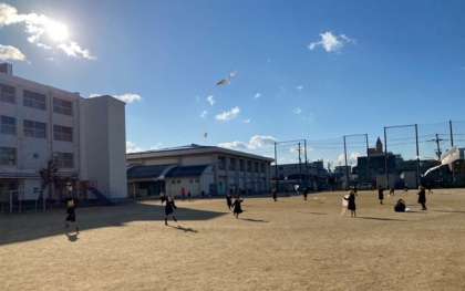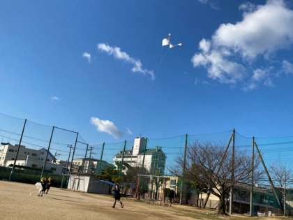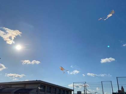 糸が絡まった時は、先生に助けてもらいましたが、うまくあがりました。凧が、大空高く舞っています。