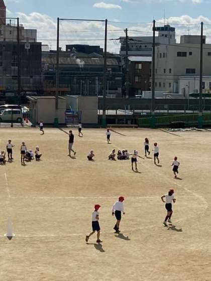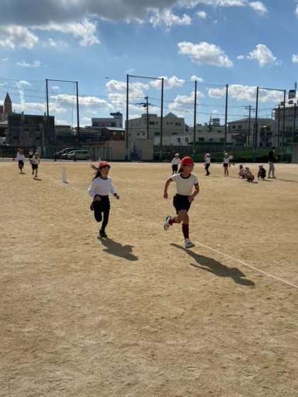 体育科で、持久走をしています。トラックを走る子どもたちに「がんばれー」と応援の声がかかっていました。
