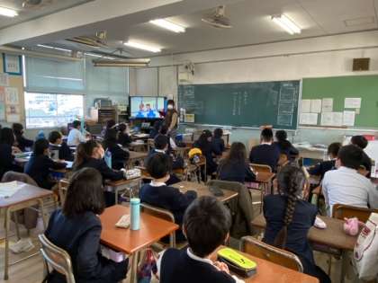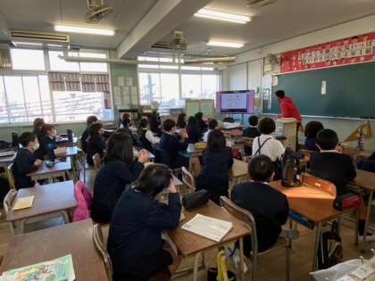 4年生の教室です。テレビの映像を見て英語に親しんでいました。