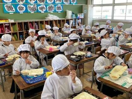 1年生の給食時間のようすです。1組でも2組でも子どもたちがおいしそうに食べています。