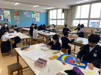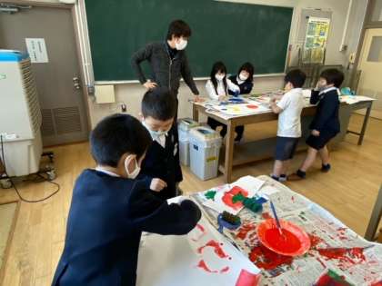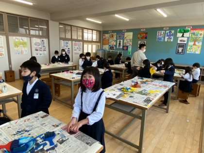 図工科で、「色版画」をしました。手につかないように注意しながら絵の具を塗っています。