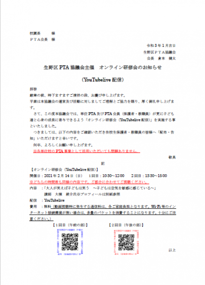 生野区PTA協議会主催のオンライン研修会のお知らせです。
