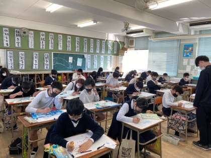 6年生の学習(1組の音楽科、2組の図工科)のようすです。
