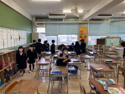 2年生の教室のようすです。子どもたちが楽しそうに遊んでいました。