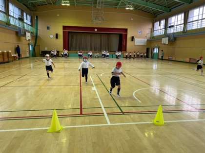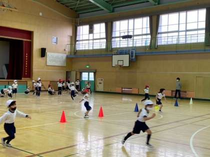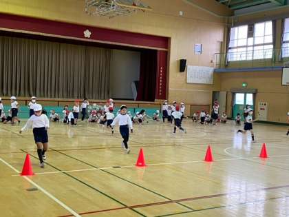 体育館で1・2組合同での体育科の授業です。コーンを使ってチーム対抗でかけっこをしました。子どもたちの歓声が響いていました。