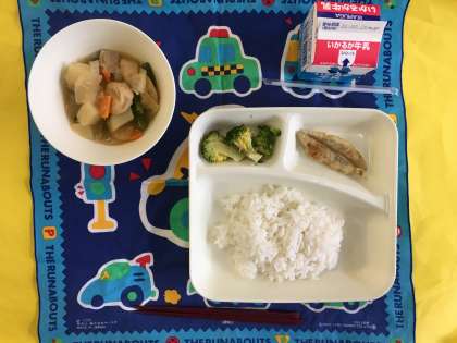 きびなごてんぷら、一口がんもとじゃがいもの煮もの、ブロッコリーのごまあえ、ご飯、牛乳