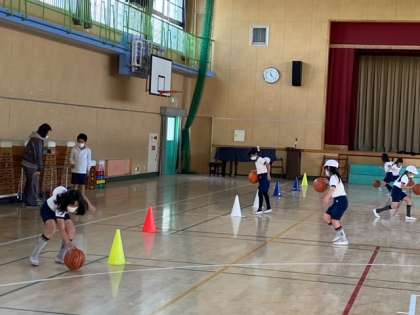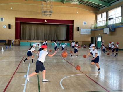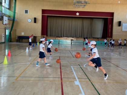体育館で、ボールを使った運動をしました。ちょうど、バスケットボールを使ってドリブルをしていました。ドリブルをしながらコーンを回るのが難しそうです。