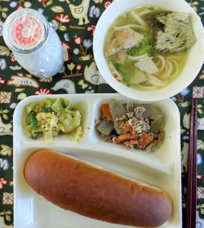 豚肉とごぼうの煮もの、なにわうどん、キャベツと三度豆のごまあえ、黒糖パン、牛乳