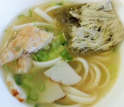 三角に切ったうすあげが、入ったうどんです。食べる時に、とろろこんぶを入れて食べます。