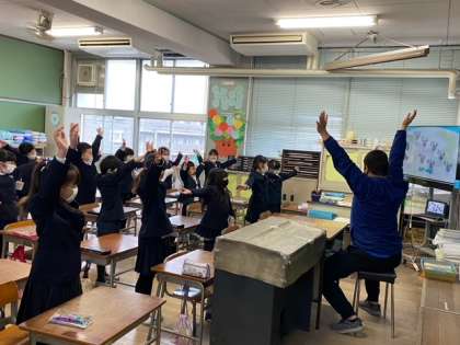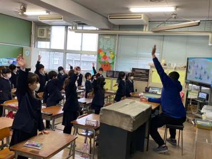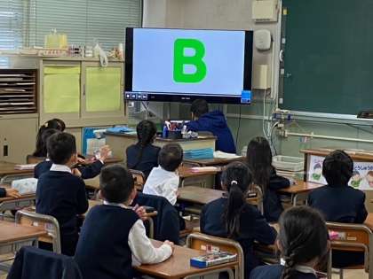 1年生2組では、テレビ画面でAから順に流れるアルファベットを見て発音しました。先生と一緒に音声を聞きながら手をあげたりしています。