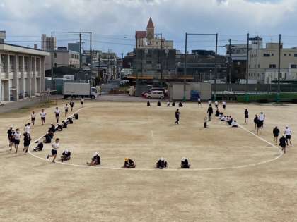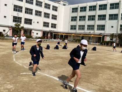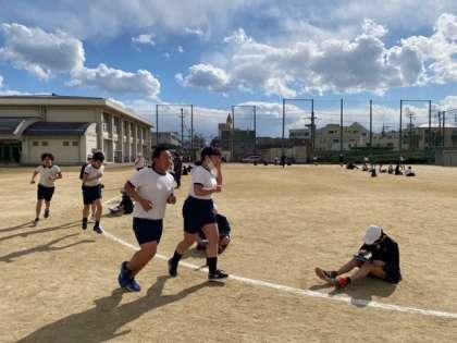 運動場での持久走です。体力・持久力の向上も大切なことですね。一桁の気温の中ですが、走ることで体が温まりました。