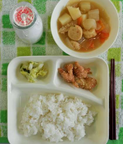 鶏肉のたつたあげ、じゃがいもと野菜の煮もの、はくさいの酢のもの、ご飯、牛乳