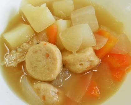 じゃがいも、だいこん、一口がんもなどが入った煮ものです。