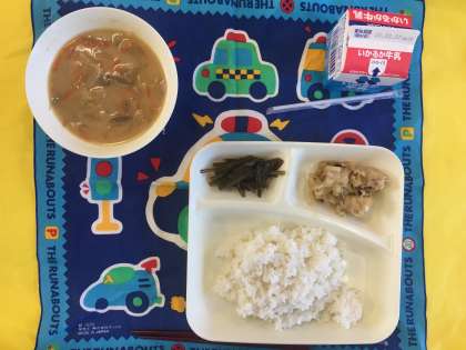 まぐろの甘辛焼き、豚汁、くきわかめのつくだ煮、ご飯、牛乳