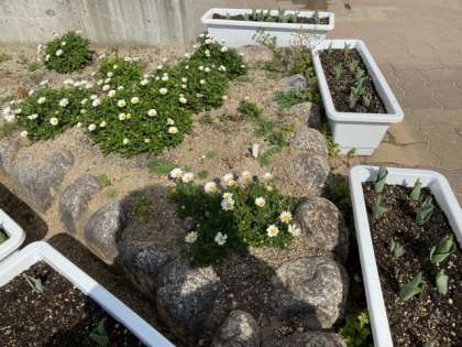 ノースポールの花がきれいに咲いています。その横で、チューリップの球根もすくすくと育っています。