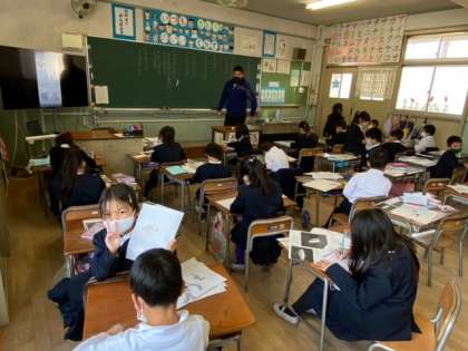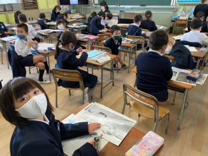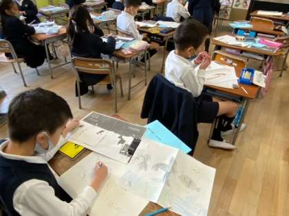 国語科で「子どもをまもるどうぶつたち」の単元です。動物によって、子どもをまもるための「ちえのつかいかた」が違うところを振り返り、動物の絵も描いていました。